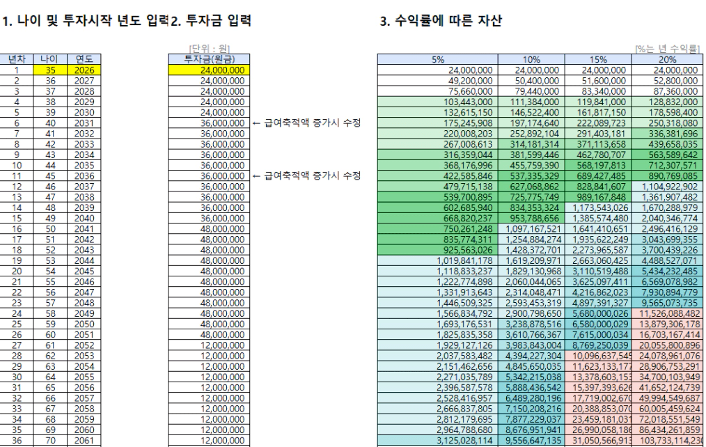 목표 금액 31.1억 (현재 나이 만35세, 연저축액 2400만원에서 시작)