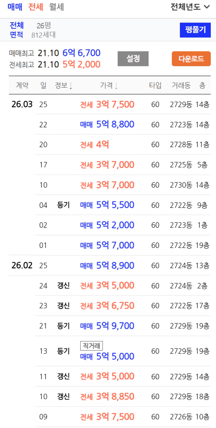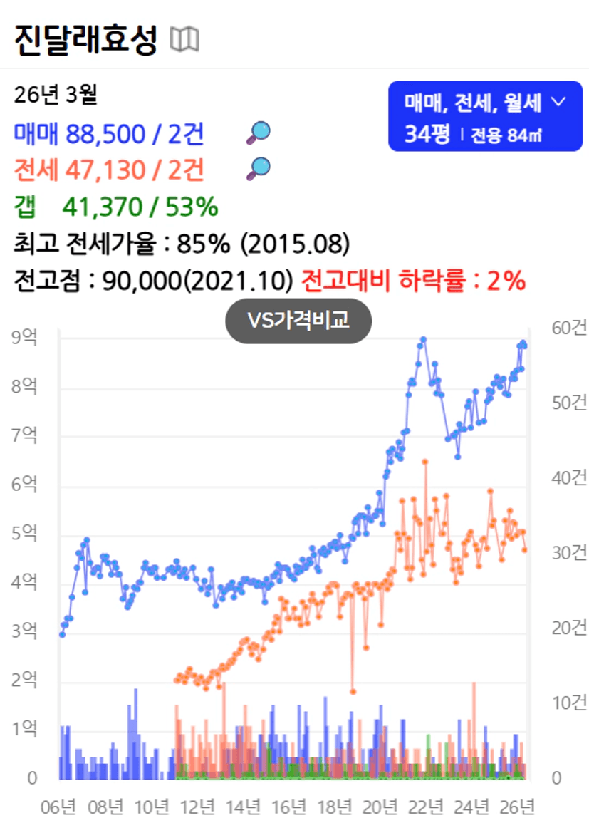 진달래효성 전고점을 갱신함. 매매, 전세거래 꾸준히 계속되고 있음.