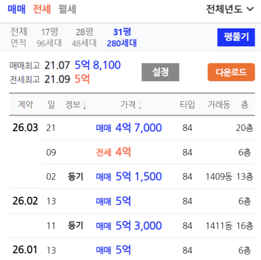 한아름 5억 초 / 반달 5억 중 → 84타입이 많지는 않음.