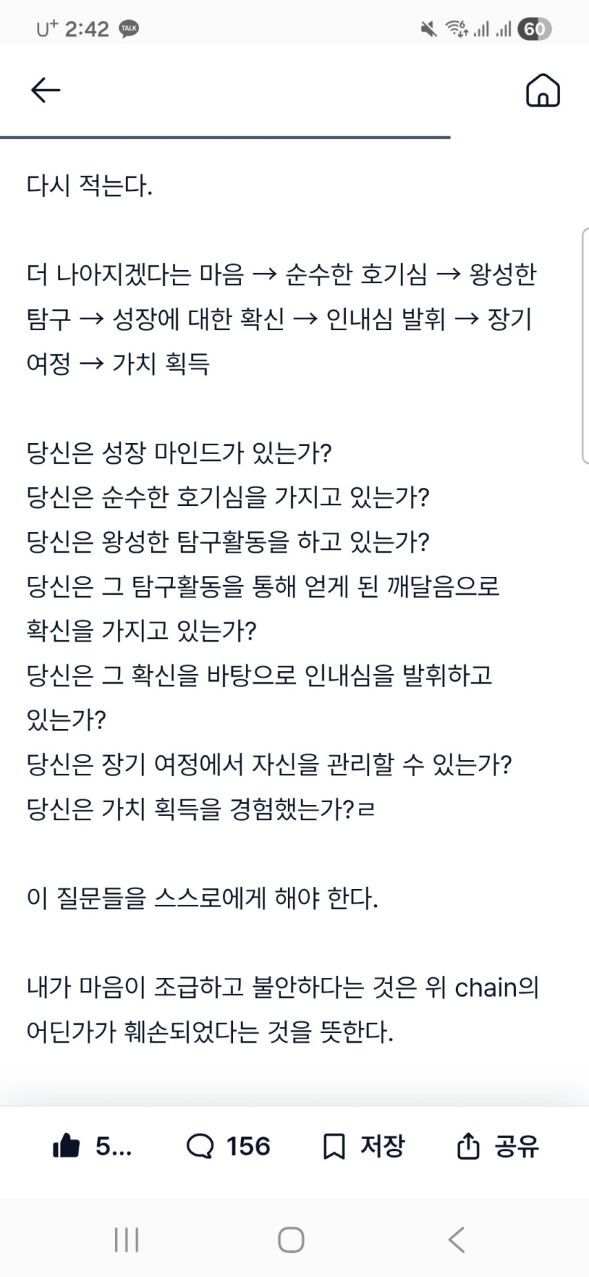 너나위님의 어제자 글을 읽으며 느끼는 것은, 만약 표면적으로 성장해야합니다! 호기심을 길러야 합니다! 그래서 탐구를 해야합니다! 라고만 생각한다면, 그것은 형식 자체에 불과하지 않습니다. 반드시 ‘스스로에게 질문들을 하는 과정'이 필요합니다. 그저 해야한다가 아니라, 왜 하지? 나는 무엇이 있지? 그래서 무엇을 얻고 싶지? … 의 수많은 과정이 필요합니다. 한순간에 얻어질 수 없습니다.