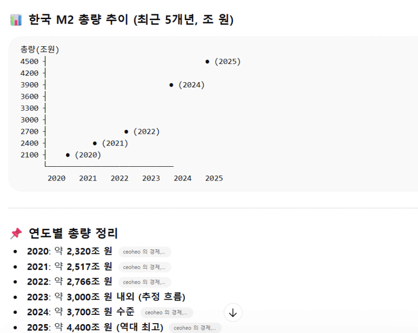 최근 26년 정부가 대출 및 세금 등 각종 규제책을 내놓고 있는 상황입니다. 이 와중에 전쟁 추경을 통해 또 20조 넘는 돈이 시중에 풀려나갈 거라고 보고 있습니다. 아래 한국 M2 통화량도 보면 지속적으로 증가하고 있고, 심지어 25년은 4,400조원으로 역대 최고 수준으로 돈이 시장에 풀린 상황입니다.