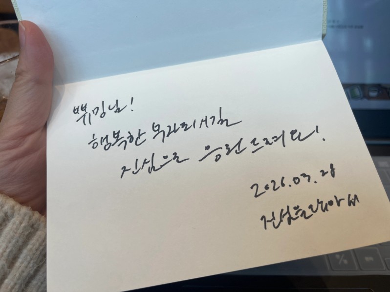 : 40분이라는 정해진 시간이 넘도록 튜터님께서 적극적으로 코칭을 해주셔서 마무리되고 나서 사인까지 부탁해도 될까 싶었는데 말씀드리니 흔쾌히 응해주셔서 응원의 메세지가 담긴 소중한 튜터님의 사진과 같이 찍은 사진까지 남겨올 수 있었습니다. 혹여나 코칭을 받다가 까먹을까봐 코칭 끝나면 나 튜터님이랑 사진 찍어줘! 라고 미리 남편에게 말했었는데 배우자분과 함께 간다면 미리 부탁해두시는 것도 좋을 것 같습니다ㅎ