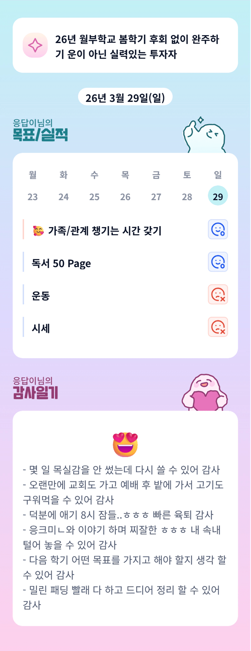 답이님~ 연속 학교 멋져부러!!! 힘내서 봄학기도 뿌시고 와용~
