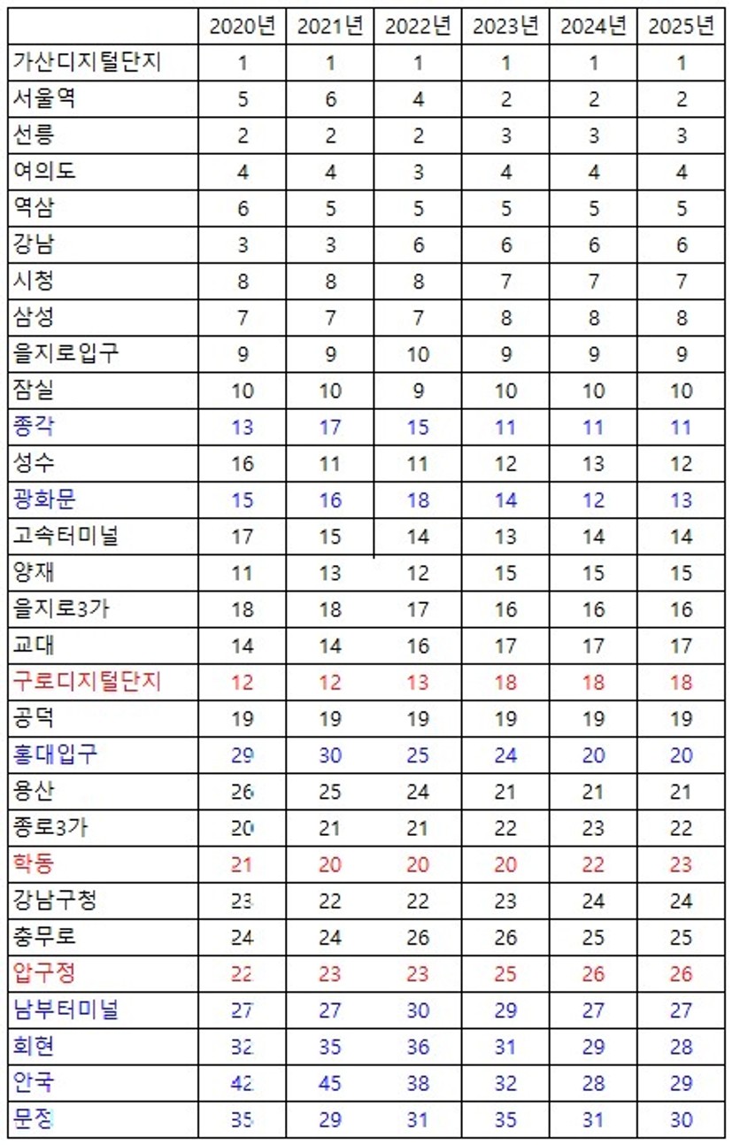 2022~23년 평균 순위 대비 2024~25년 평균 순위가 2계단 이상 올라간 역을 파란색, 2계단 이상 내려간 역을 빨간색으로 칠해보았습니다.