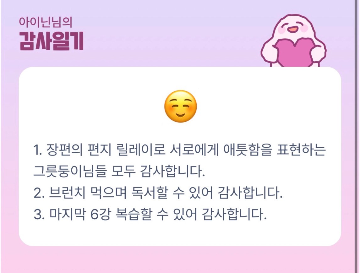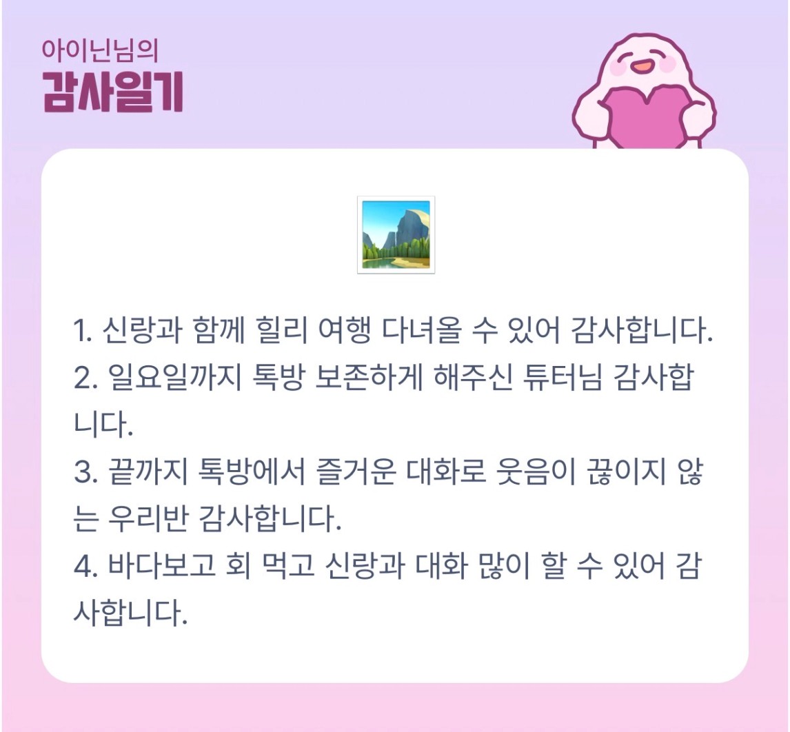 힐링 시간을 보내셔서 다행입니다 😊 방학기간에도 독강임투를 대다나다요 😁