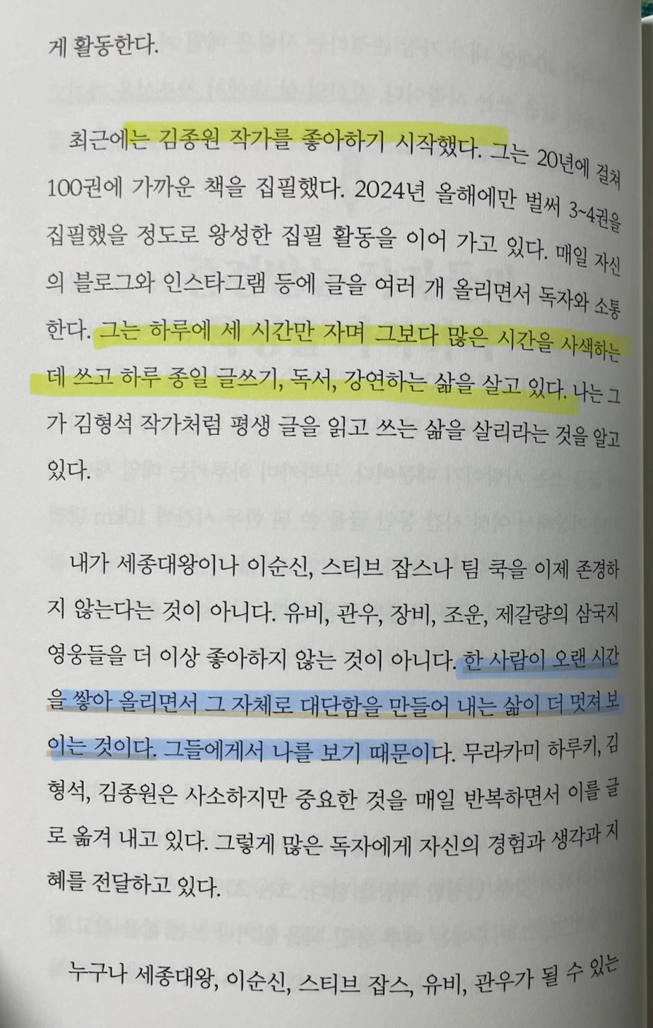p.60 한 사람이 오랜 시간을 쌓아 올리면서 그 자체로 대단함을 만들어 내는 삶이 더 멋져 보이는 것이다. 그들에게서 나를 보기 때문이다.