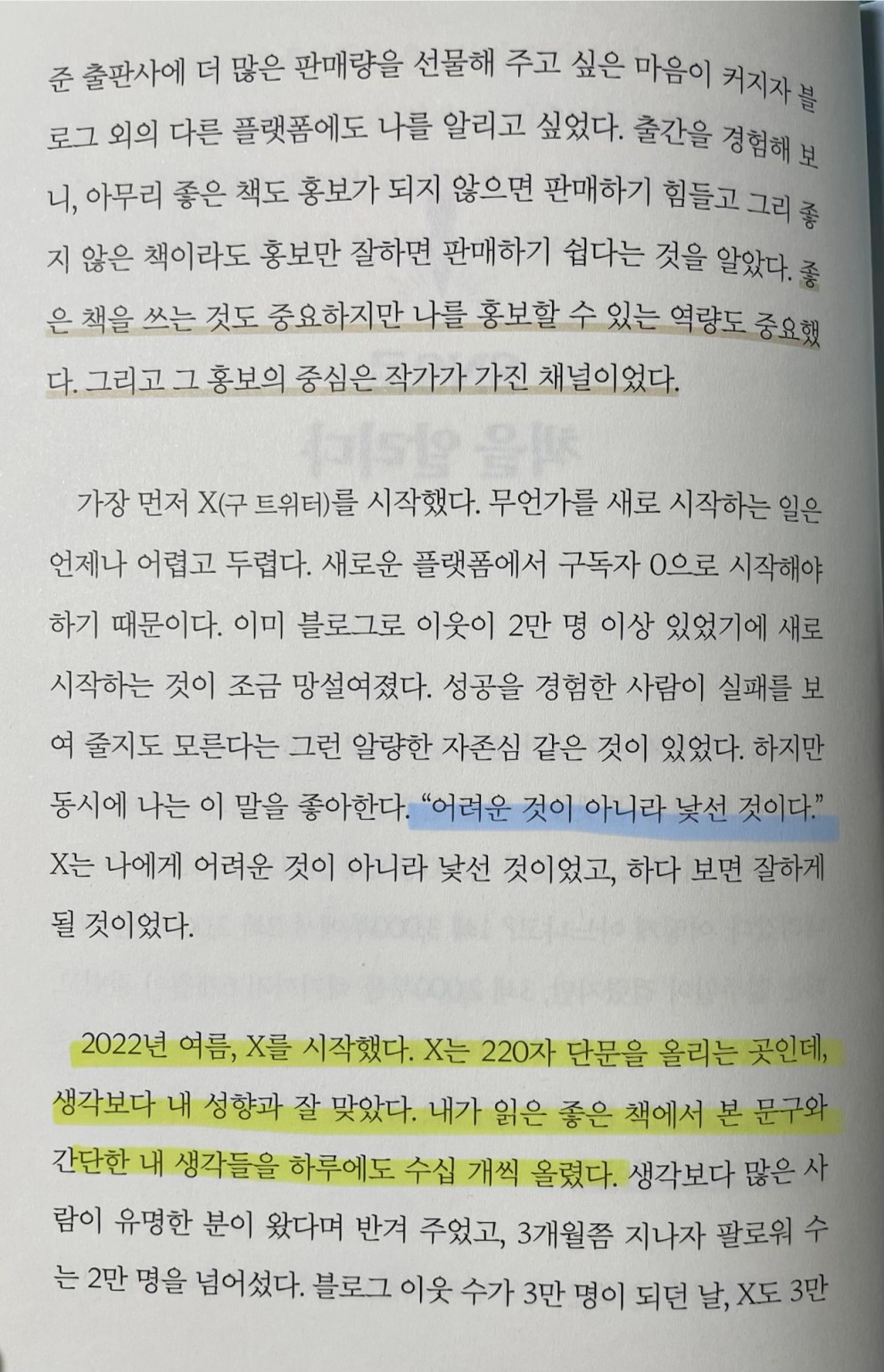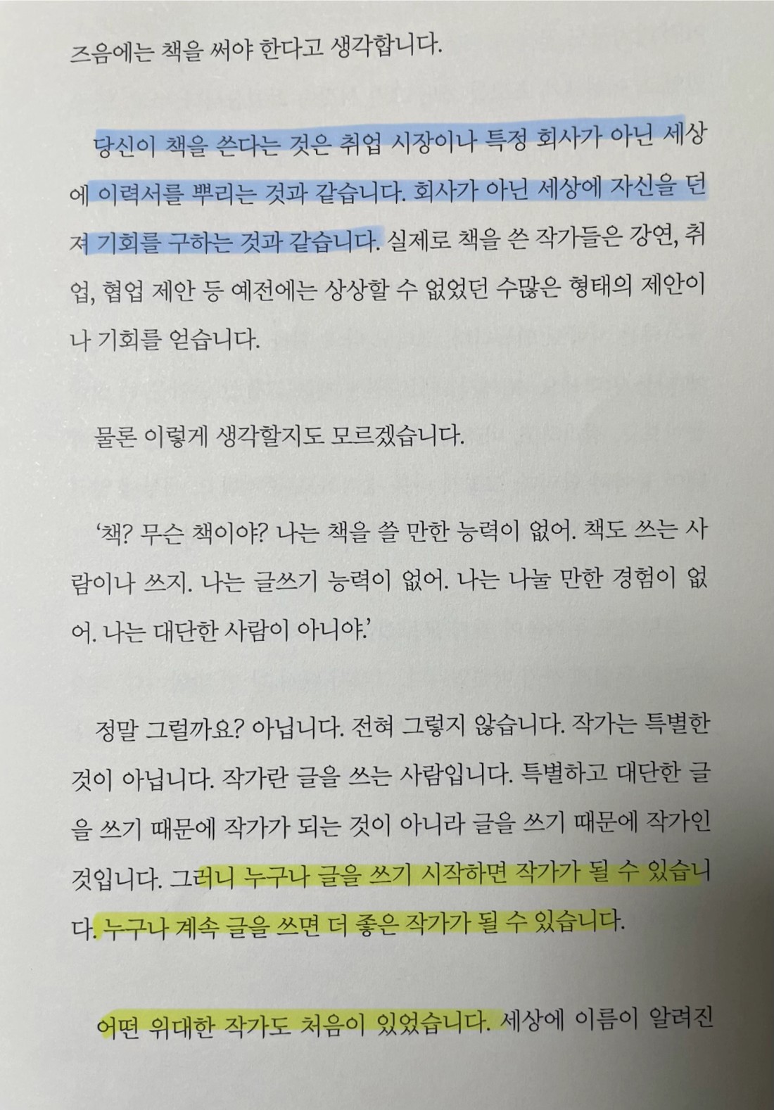 p.11 당신이 책을 쓴다는 것은 취업 시장이나 특정 회사가 아닌 세상에 이력서를 뿌리는 것과 같습니다. 회사가 아닌 세상에 자신을 던져 기회를 구하는 것과 같습니다.