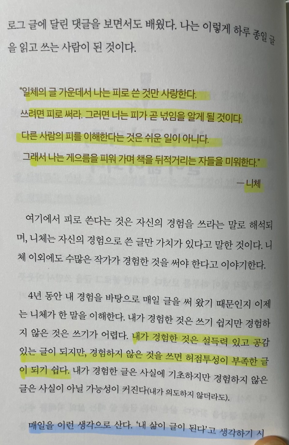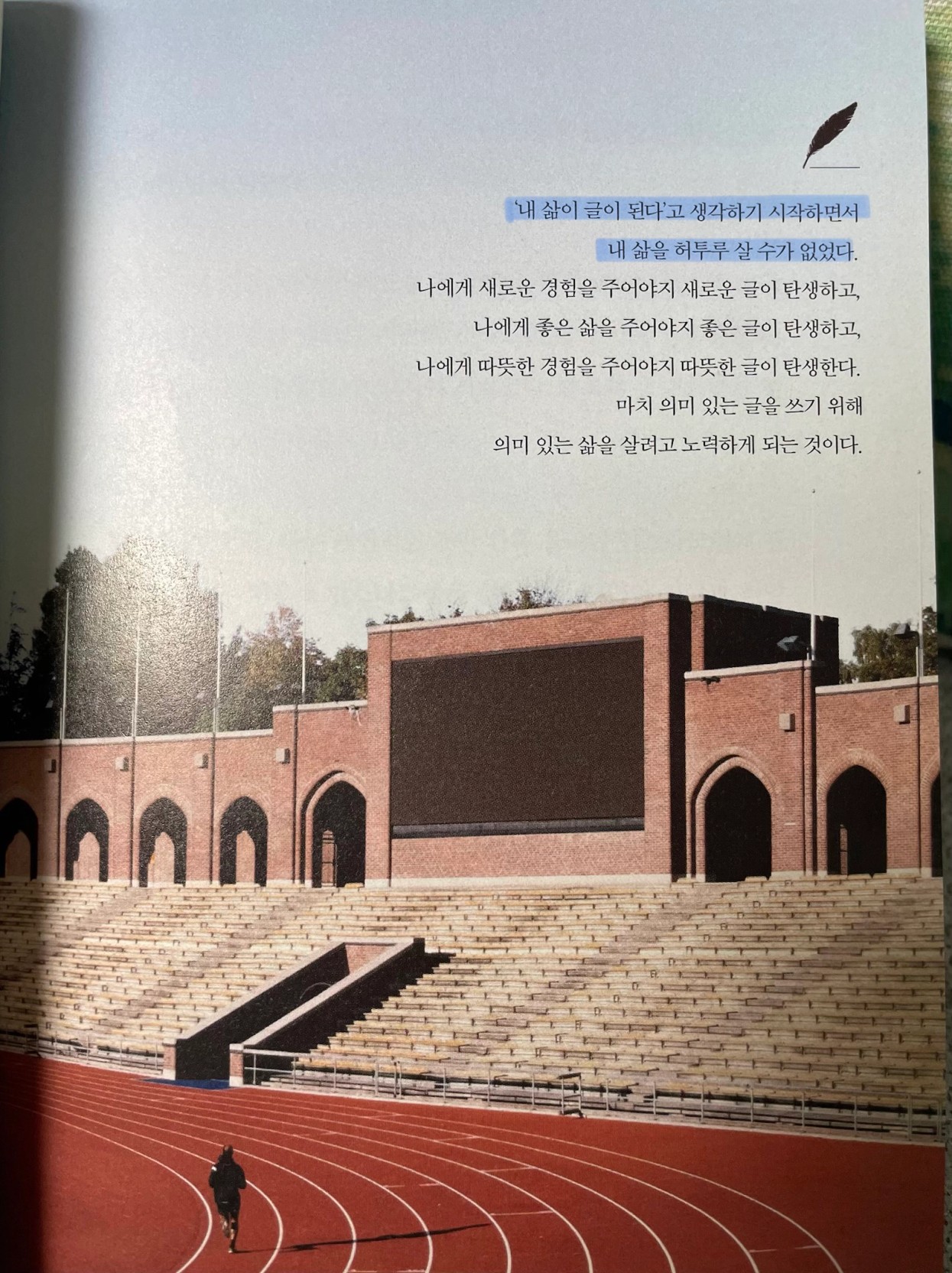 -'내 삶이 글이 된다'고 생각하기 시작하면서 내 삶을 허투루 살 수가 없었다. 나에게 새로운 경험을 주어야지 새로운 글이 탄생하고, 나에게 좋은 삶을 주어야지 좋은 글이 탄생하고, 나에게 따뜻한 경험을 주어야지 따뜻한 글이 탄생한다.