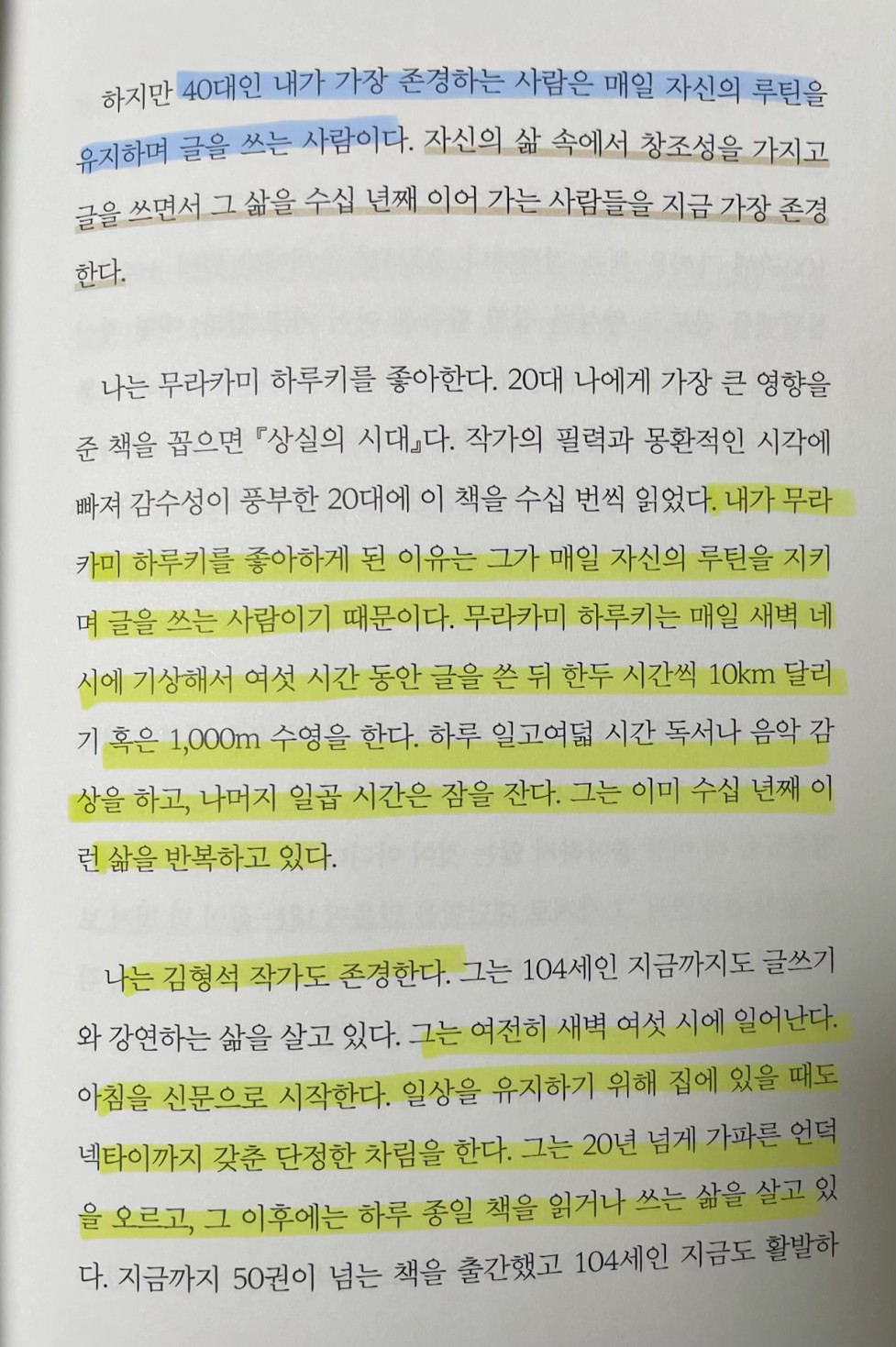 p.59 40대인 내가 가장 존경하는 사람은 매일 자신의 루틴을 유지하며 글을 쓰는 사람이다. .. 내가 무라카미 하루키를 좋아하게 된 이유는 그가 매일 자신의 루틴을 지키며 글을 쓰는 사람이기 때문이다. 무라카미 하루키는 매일 새벽 네 시에 기상해서 여섯 시간 동안 글을 쓴 뒤 한두 시간씩 10km 달리기 혹은 1,000m 수영을 한다.
