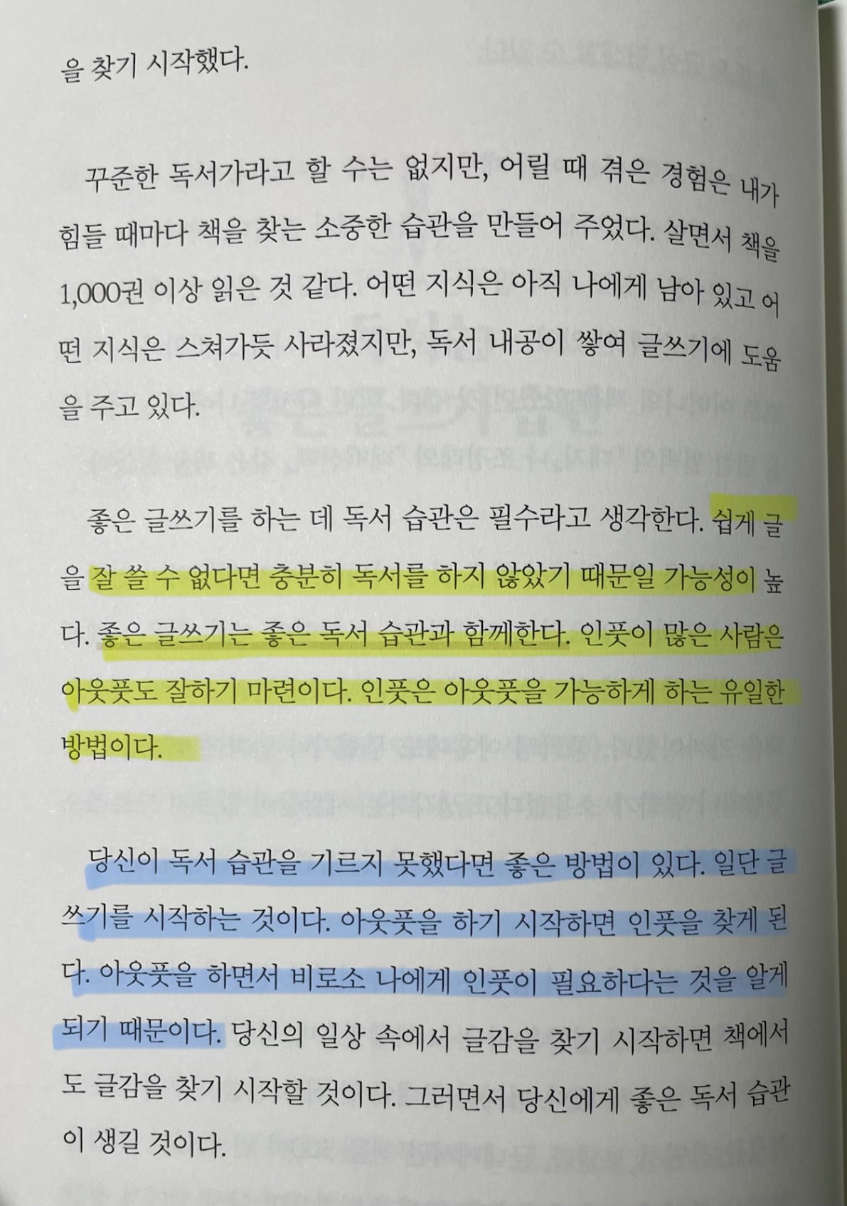오늘 읽은 부분 중 저에게 가장 인상적이었던 구절은 '나에게 좋은 삶을 주어야지 좋은 글이 탄생한다'였습니다. 나는 지금 나에게 좋은 삶을 주고 있는가? 나는 풍부한 인풋이 있어 아웃풋이 있을 삶을 살고 있는가? 자문해 봅니다. 새로운 한 주, 우리 자신에게 좋은 삶 선물해 봅시다. 화이팅💕
