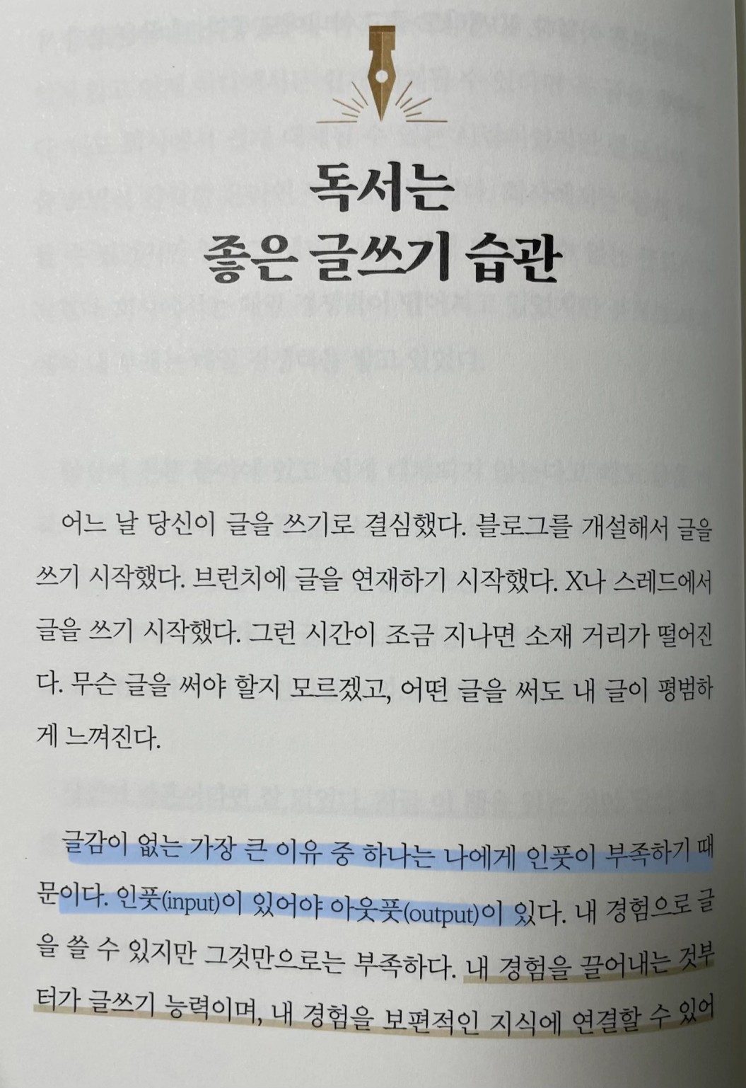 p.50 글감이 없는 가장 큰 이유 중 하나는 나에게 인풋이 부족하기 때문이다. 인풋(input)이 있어야 아웃풋(output)이 있다.