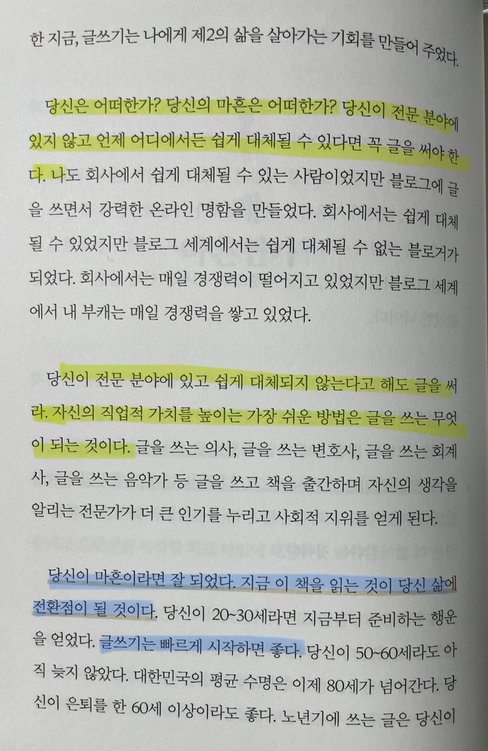 p.48 당신은 어떠한가? 당신의 마흔은 어떠한가? 당신이 전문 분야에 있지 않고 언제 어디에서는 쉽게 대체될 수 있다면 꼭 글을 써야 한다.