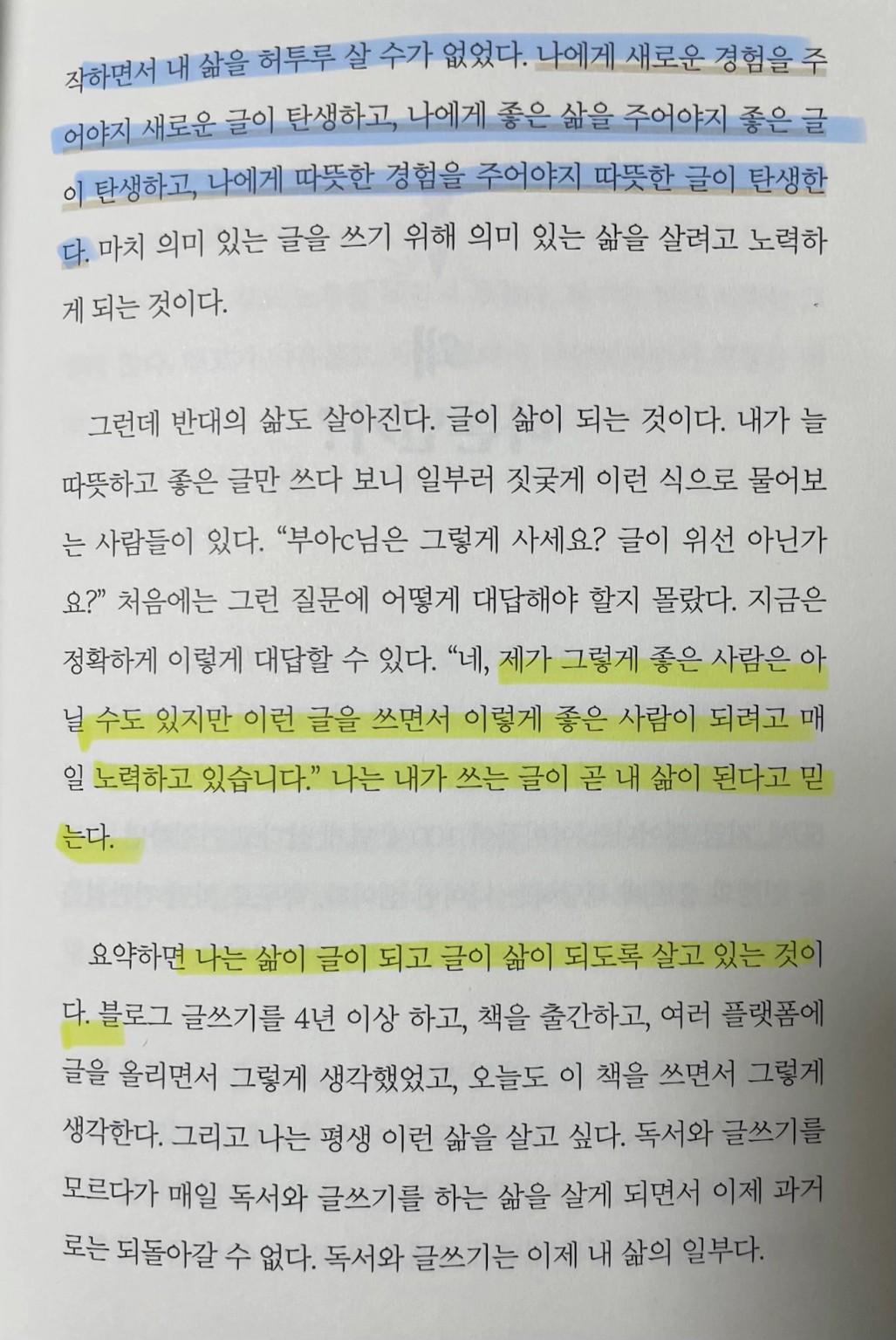 p.41 '내 삶이 글이 된다'고 생각하기 시작하면서 내 삶을 허투루 살 수가 없었다. 나에게 새로운 경험을 주어야지 새로운 글이 탄생하고, 나에게 좋은 삶을 주어야지 좋은 글이 탄생하고, 나에게 따뜻한 경험을 주어야지 따뜻한 글이 탄생한다. 마치 의미 있는 글을 쓰기 위해 의미 있는 삶을 살려고 노력하게 되는 것이다.