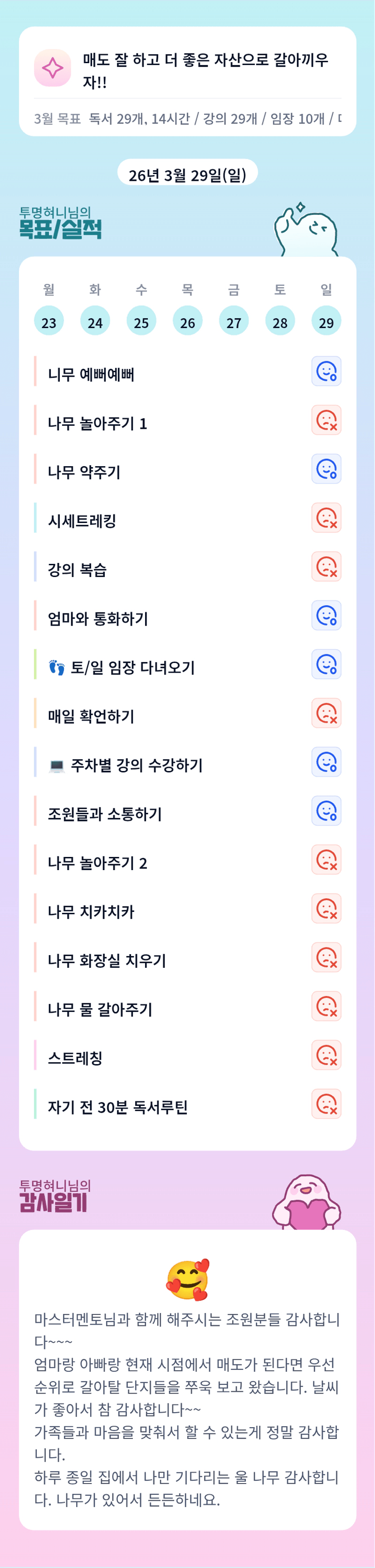 지금 다시 보니 혀니님 루틴 절반이 나무군요..? 내마실 마무리까지 화이팅!!