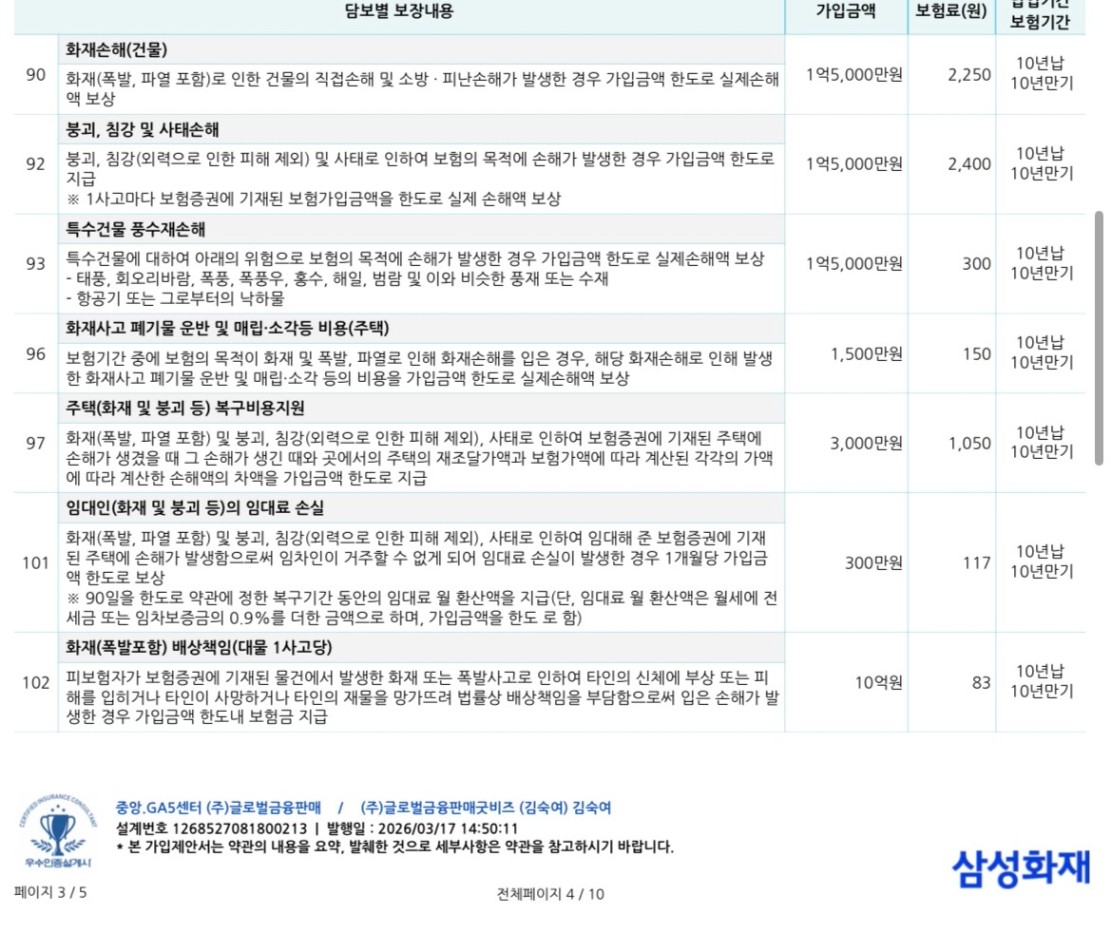 안녕하세요~ 도도네님 저희가 보통 화재보험 가입하는 이유는 누수에 관한 리스크를 헷지하기 위함인데요. 30년 이상 아파트라면 가입이 꽤나 어렵고 상품이 거의 없더라구요. 삼성화재 경우 보통 4개 물건까지 묶을 수 있는 걸로 알고 있습니다. 추후 추가하시면 될 거 같구요. 누수에서 중요한 것은 급배수, 임대인 배상책임 특약입니다. 2개모두 가입 잘하셨네요^^ 위에 선택님께서도 언급해주셨듯이 보장기간에 대해서 연식 대비 고려해보시면 좋을거 같습니다. 10년 이상 장기보유물건이라면 그 이후에 30년 이상의 연식이라면 또 가입이 어려울 수 있기 때문이에요. 그리고 급배수의 경우 면책기간 90일 이상이 지나야 보장받을 수 있다는 것도 명심하시면 좋습니다. 마지막으로 일상배상책임보험이 없으시다면 추가하는 것도 좋아보입니다~