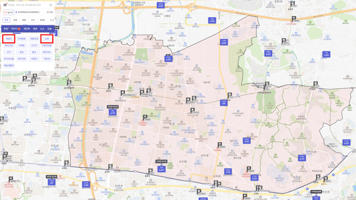 상권, 학원가 버튼이 있습니다.