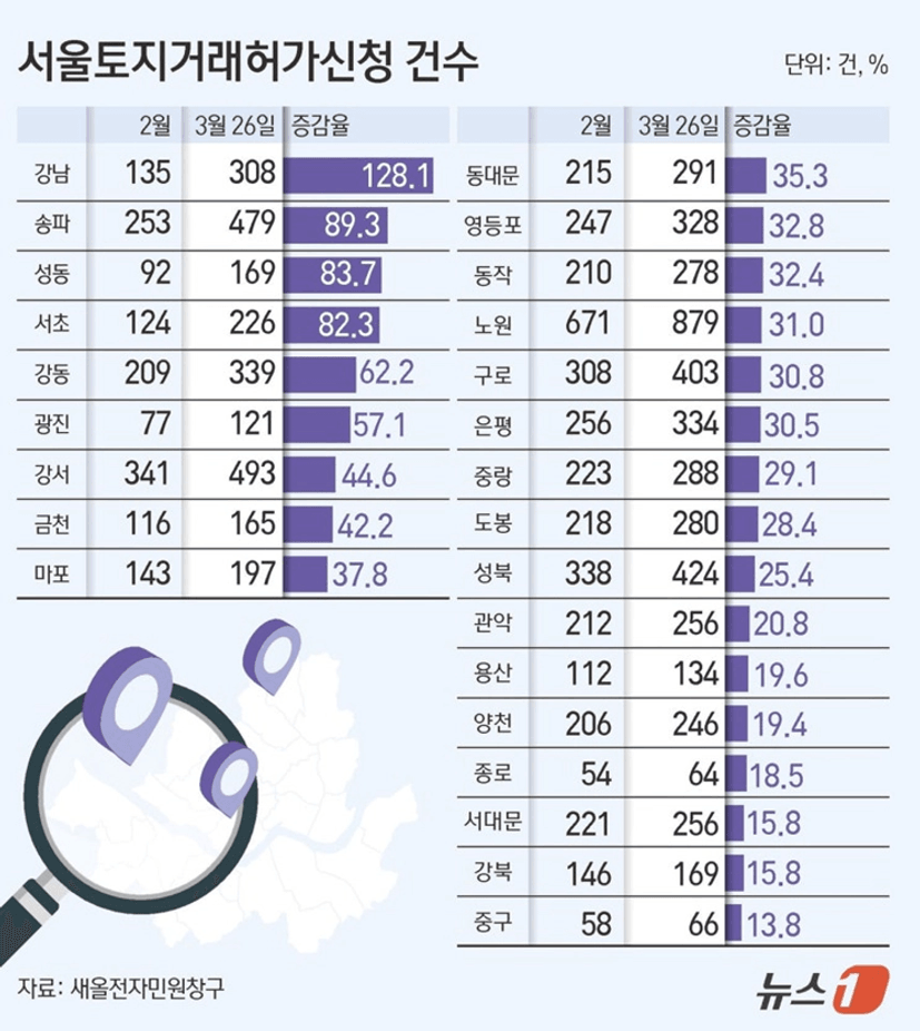 앞서 서울 아파트 전·월세 갱신 비중은 토지거래허가구역 지정 직후인 작년 10월 41.93%, 11월 39.84% 수준에 머물렀다. 하지만 12월(43.22%)을 기점으로 반등하기 시작해 올해 1월 45.9%, 2월 49%로 지속 상승했고, 급기야 3월 들어 절반을 넘어선 것이다.