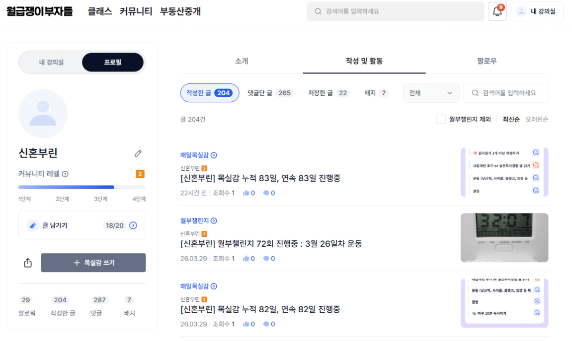 매일 월부 방문 및 좋은 글 정독과 댓글남기기 챌린지댓글 수 287개