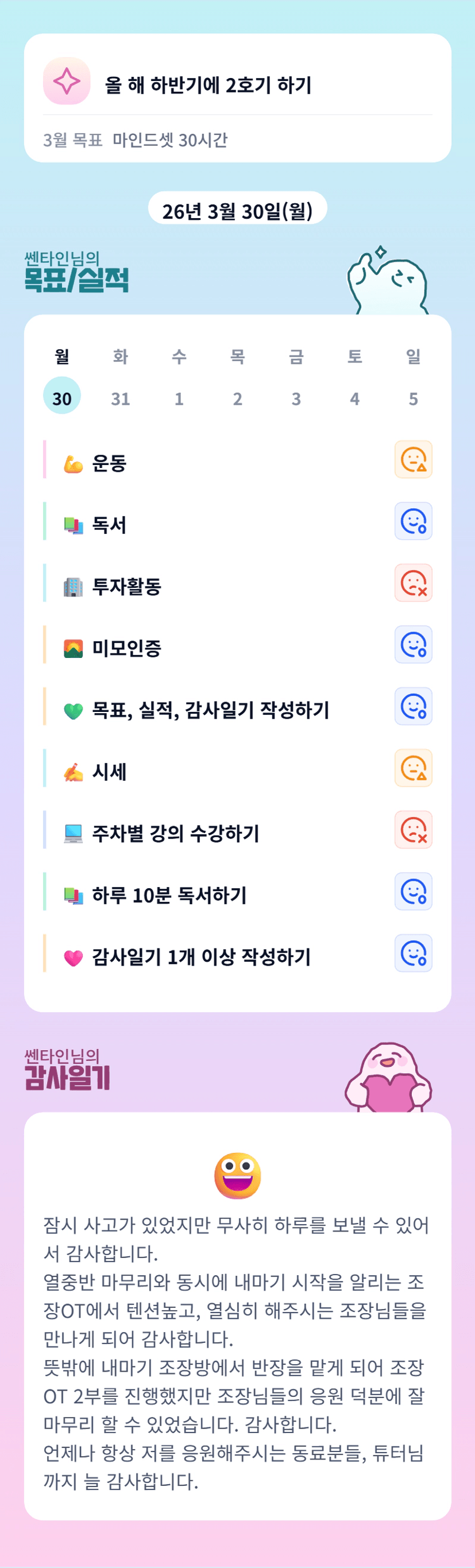쎈타인님... 계속 조장지원하셨군요!!! 반장까지!!! 3월 한달 정말 수고하셨습니다~~~ 4월도 힘내서 보내세요.. 화이팅입니다^^