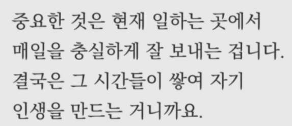: 우리의 시간은 한정적이다 눈을 뜨고 있는 반을 회사에서 시간을 보낸다 내 인생의 반을 투자하는 무엇인가이다 그래서 일을 가치있게 생각해야한다