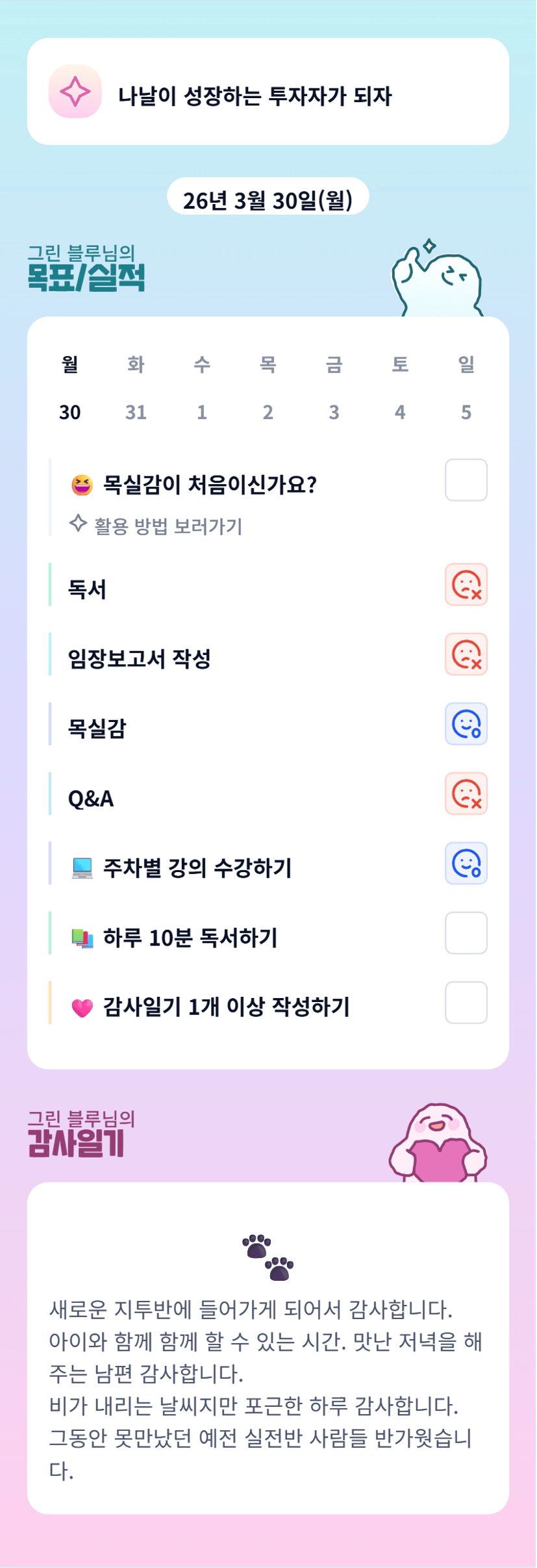 오오 블루님 월학하시구 바로 지투오신거군요!! 크 멋지십니다! 4월 한달 함께 화이팅입니다! 잘부탁드려요~!!