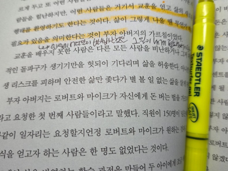 : 교육을 많이 받은 아버지에게는 직업의 안정성이 모든 것을 의미했다. 부자 아버지에게는 배움이 모든 것을 의미했다.얼마를 버느냐보다는 무엇을 배울수 있는지를 보고 일자리를 찾아야 한다. 인생은 운동하러 체육관에 가는 것과 많이 닮았다. 가장 힘든 부분은 가기로 결정하는데 있다. 일단 그것만 넘어가면 나머지는 쉬워 진다. 재정적으로 고생하거나 실제 능력보다 적게 버는 이유는 자신이 아는것 때문이 아니라 그들이 모르는 것 때문에 벌어지는 일이다.