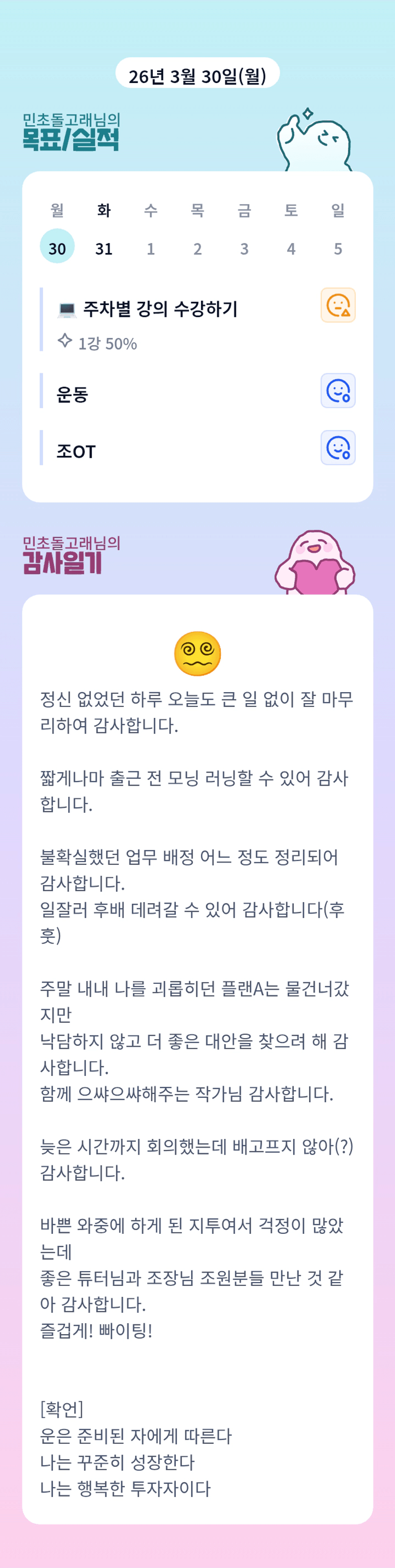 민초님, 다사다난한 일상이지만 넘 멋지게 해내시는 모습이 그려집니다!!! 한 달 동안 홧팅입니다!!! ^^