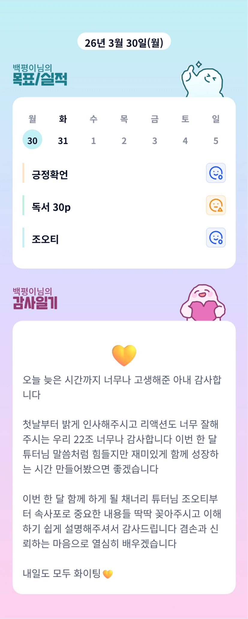 백평이님 오늘도 고생 많으셨습니다! 한 달 동안 아쟈쟈 빠이팅!!
