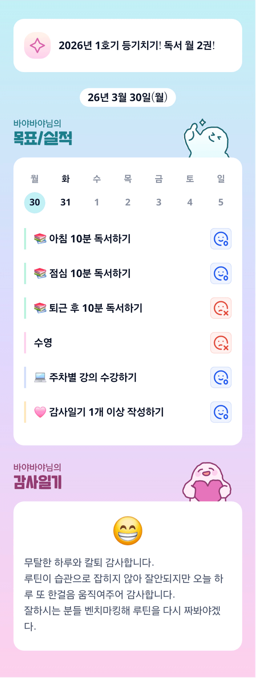 바야님 이미 루틴 좋아보여요 ㅎㅎ 실패하셔도 그 루틴또한 경험이 되더라구요. 한달간 고생하셨고 4월 꼭 좋은 경험으로 투자하시길 기원합니다. 감사일기 잘 써주셔서 감사해요^^