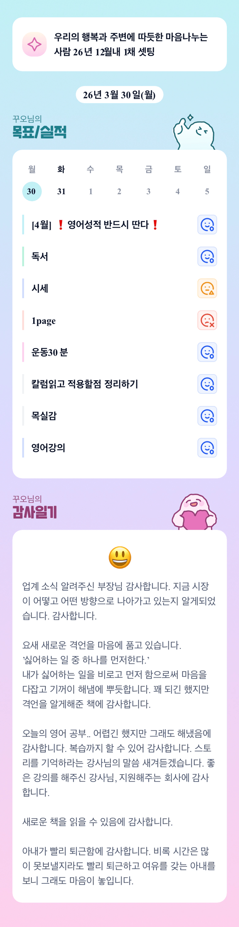 싫어하는 일 중 하나를 한다. 넘 좋네요. 그냥 싫어하는 일을 먼저 한다 라는 것 보다 '하나'를 한다고 특정하니까 더 실행력 생길 것 같아요. 감사합니다