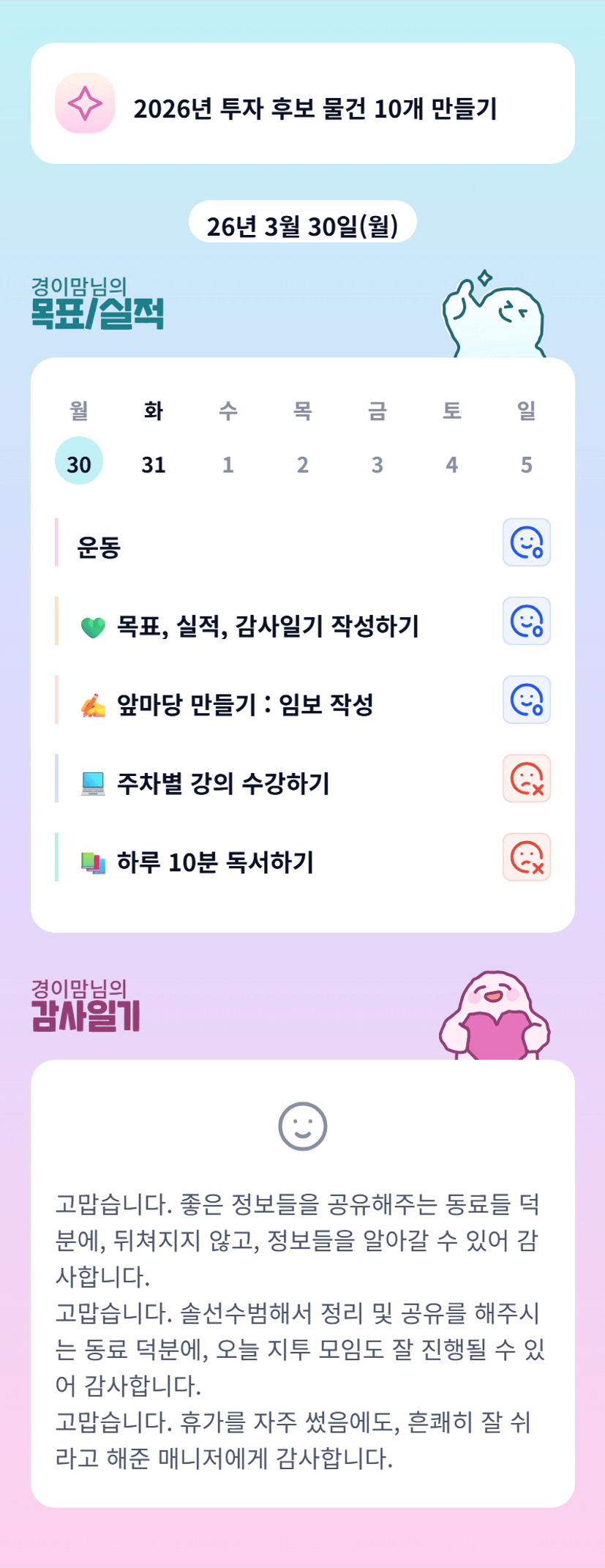 경이맘님!!! 동료들에 대한 감사가 너무 따뜻합니다~ 이번달 함께 화이팅!!^ㅡ^