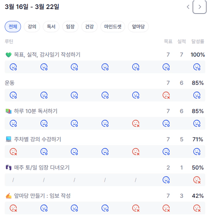 전반적인 루틴 관리가 이전보다 나아졌는데, 조금만 주의를 기울이고, 루틴 실천을 위해 노력하면 되지 않을까 싶다.