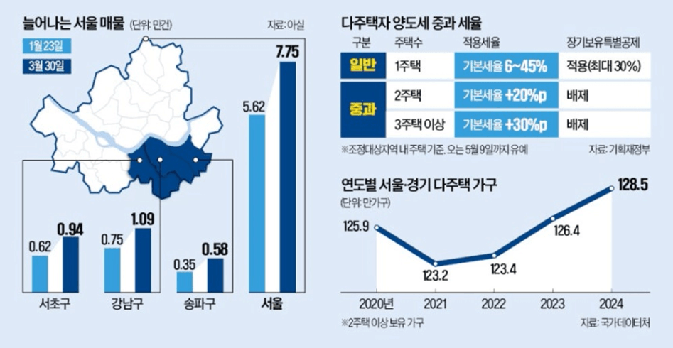 "- 서초구 반포동의 한 공인중개사는 “앞으로 보유세 부담이 커질 것이라는 우려에 다주택자뿐만 아니라 고가 1주택자도 고민이 크다”며 “최악의 경우 4월 초중순까지는 양도세 중과를 피하려는 막판 급매물이 나올 수 있고, 1주택자 매물은 하반기 보유세 개편안에 따라 더 늘어날 수 있다”고 짚었다.