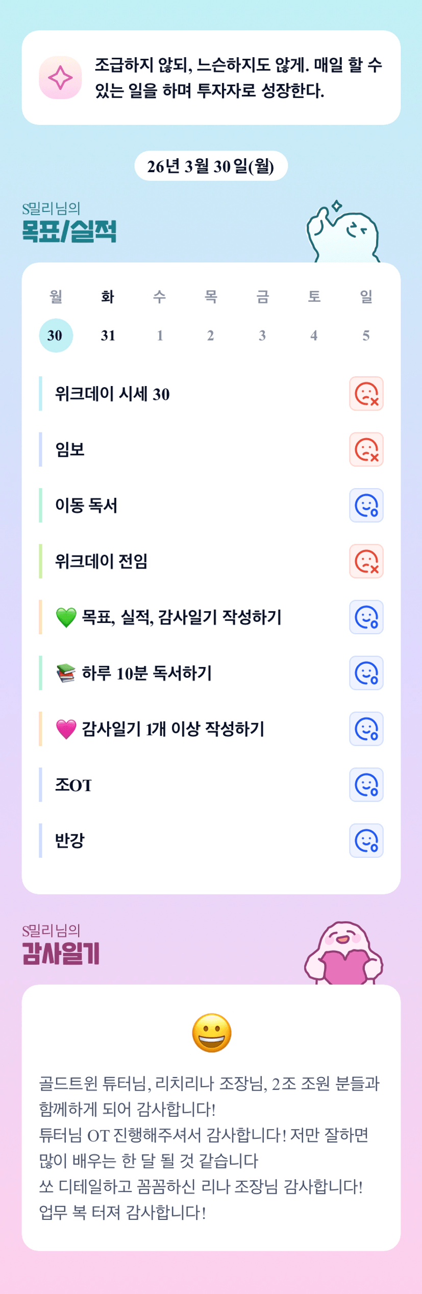 밀리님 만나서 반갑습니다. 업무 복 터지셨지만 엄청 잘하실것 같습니다. 한달동안 잘 부탁드립니다 !