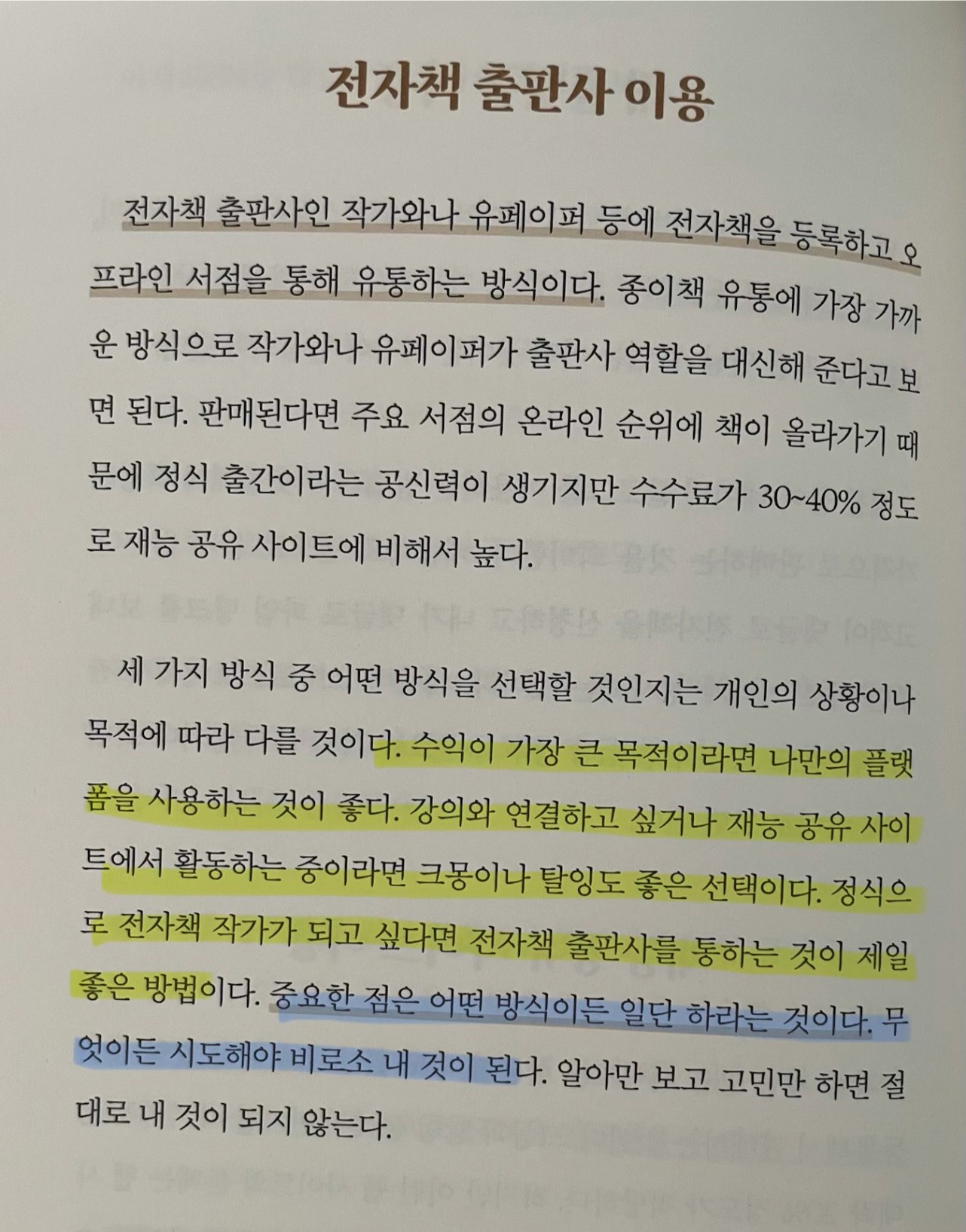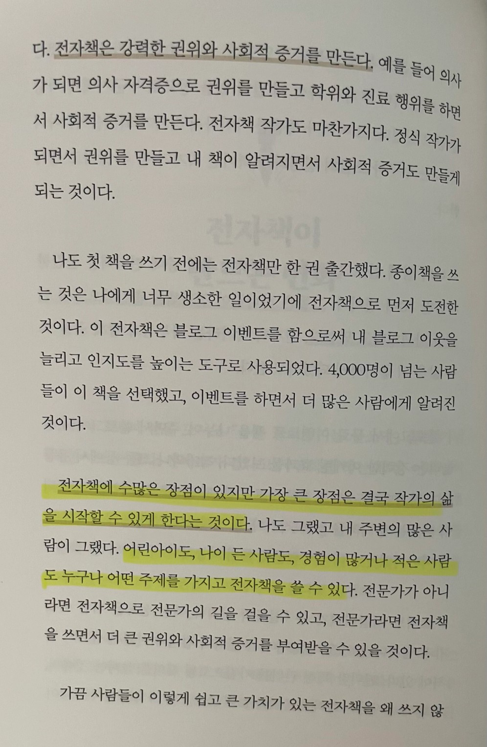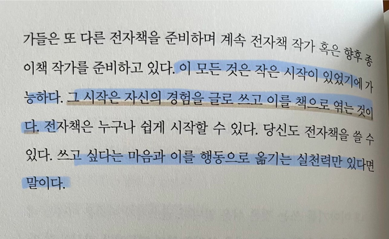p.100 전자책에 수많은 장점이 있지만 가장 큰 장점은 결국 작가의 삶을 시작할 수 있게 한다는 것이다. .. 어린아이도, 나이 든 사람도, 경험이 많거나 적은 사람도 누구나..