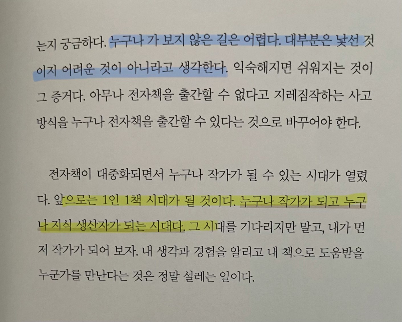 p.101 누구나 가 보지 않은 길은 어렵다. 대부분은 낯선 것이지 어려운 것이 아니라고 생각한다. .. 앞으로는 1인 1책 시대가 될 것이다. 누구나 작가가 되고 누구나 지식 생산자가 되는 시대다.
