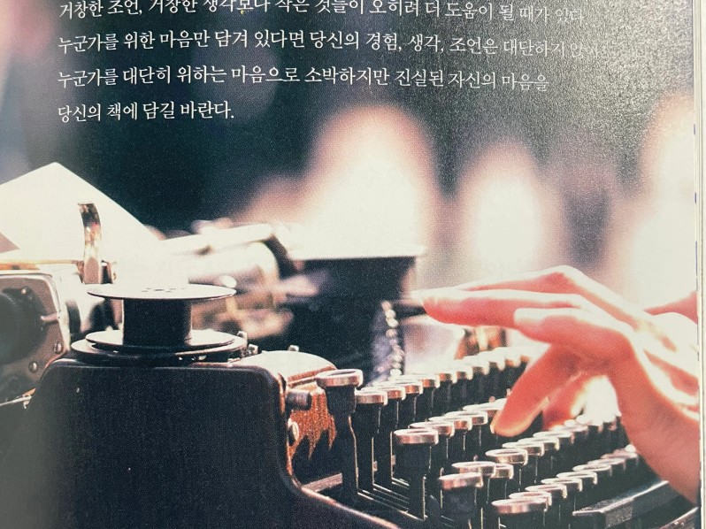 p.137 당신이 책을 쓰려고 한다면, 반드시 누군가를 위한 마음으로 써야 한다. .. 우리는 살아가면서 누군가의 작은 조언, 작은 생각이 큰 도움이 되었다고 느낄 때가 많다. .. 누군가를 대단히 위하는 마음으로 소박하지만 진실된 자신의 마음을 당신의 책에 담길 바란다.