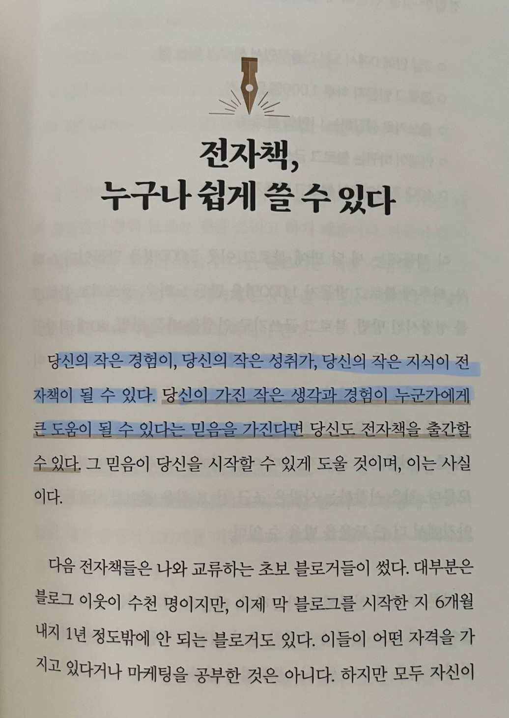 p.65 당신의 작은 경험이, 당신의 작은 성취가, 당신의 작은 지식이 전자책이 될 수 있다. 당신이 가진 작은 생각과 경험이 누군가에게 큰 도움이 될 수 있다는 믿음을 가진다면..
