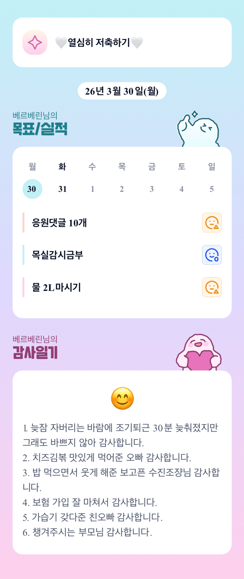 베린님~~~~~~~ 이쁜 사랑하고 있는게 느껴지네요~~꽁냥꽁냥도 늘 느끼고 갑니다요~~!!! 화이팅!!!!!!!!