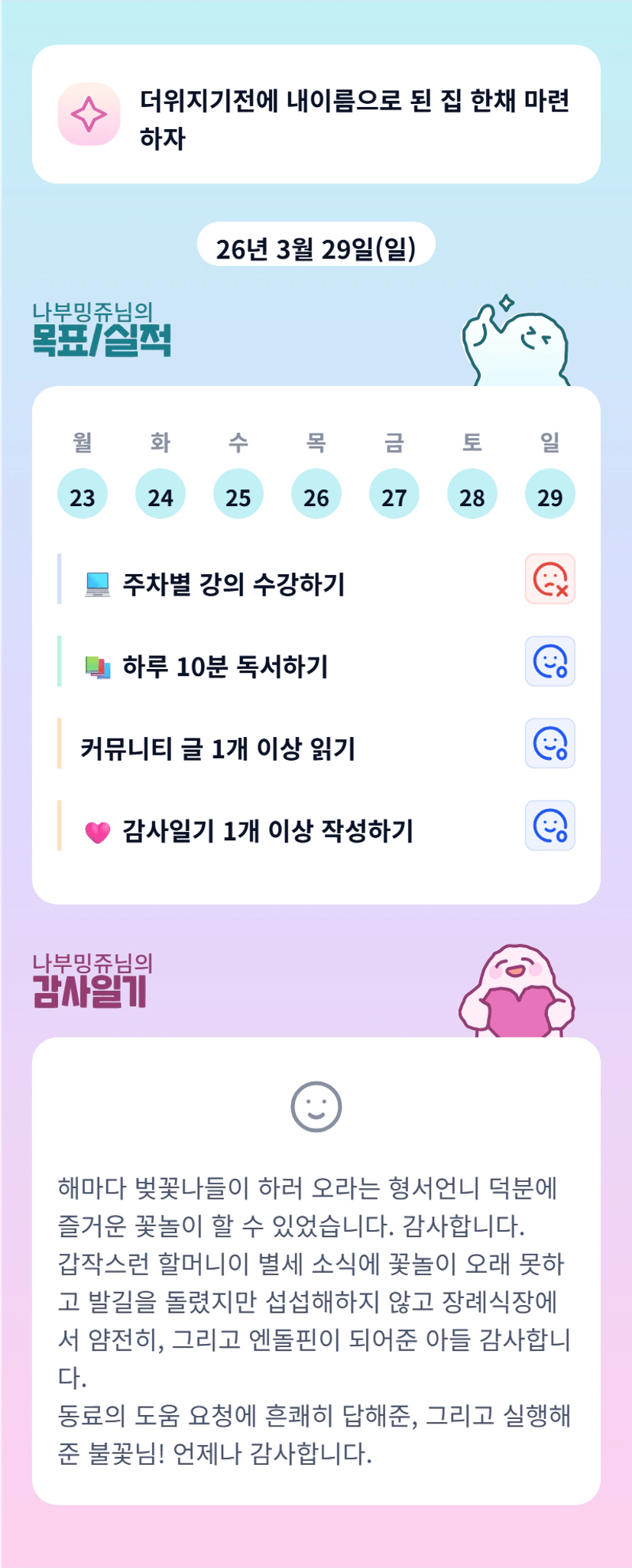 바쁜 하루를 보내셨을 밍쥬님..! 그래도 그 사이에 또 감사할 일들을 찾아서 목실감까지 멋지십니다..! 오늘도 파텡파텡!