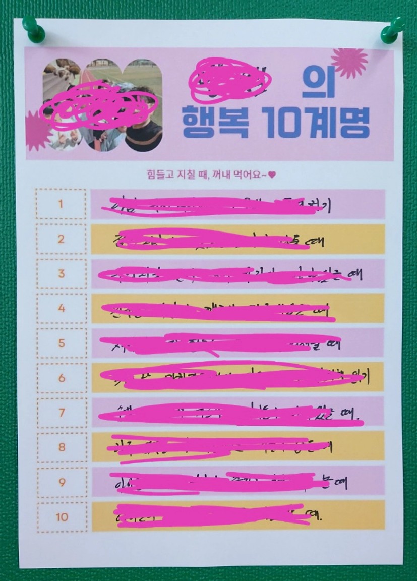 그래서 정말 눈에 보이는 변화를 위해 내 삶에 강의에서 배운 단 한 가지라도 ‘적용’해야겠다는 생각을 갖게 되었습니다. ‘당장 눈에 보이는 뭔가를 해야겠다!’ 라는 생각으로요. 그래서 이번 강의를 듣고 미루다 미루다 주우님께서 말씀하신 ‘행복 10계명’을 작성하게 되었고, 가족과 다 함께 해보려하다가 우선은 제 직장에서 함께하는 사람들과 먼저 해봤습니다. 오늘은 꼭 가족과도 함께 해보려고 합니다.