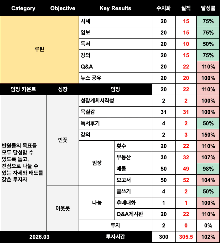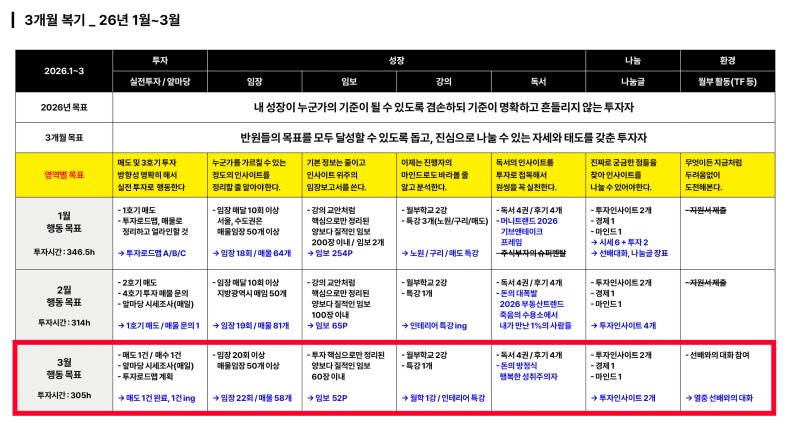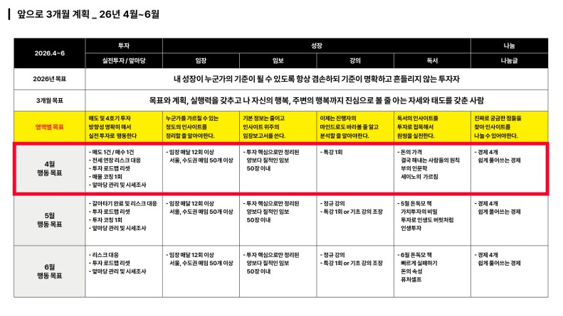 4월 우선적 목표는 투자와 리스크 대응입니다. 현재 계획으로 매일 점검하며 투자에 집중하며 매도와 매수, 그리고 전세까지 계획했던 일에 어긋나더라도 유연하게 대응해야한다는 튜터님의 말씀을 기억하며 계속해서 현장에 있는 사람이 되어야겠다는 생각이 들었습니다. 현재 자금 계획이 가장 중요한 부분이기에 20일 이내 정리할 수 있는 부분들은 최대한 정리를 통해 리스크를 줄일 수 있는 방안까지 같이 고민하며 항상 배웠던 투자의 기본 본질부터 지킬 수 있도록 하겠습니다. 그리고 이번 달 부터는 투자에 대한 알기 쉬운 이야기들을 새롭게 시리즈로 나눔글을 적어볼 계획입니다. 항상 공부를 하면서 마음 속 불편함으로 있던 부분들을 꺼내어서 스스로 공부하며 깨닫게 되는 점들을 쉽게 풀어쓰는 방식에 대해 고민해보고 싶습니다. 늘 곁에서 응원해주시고 함께 해주시는 소중한 선생님들, 동료분들 감사합니다.