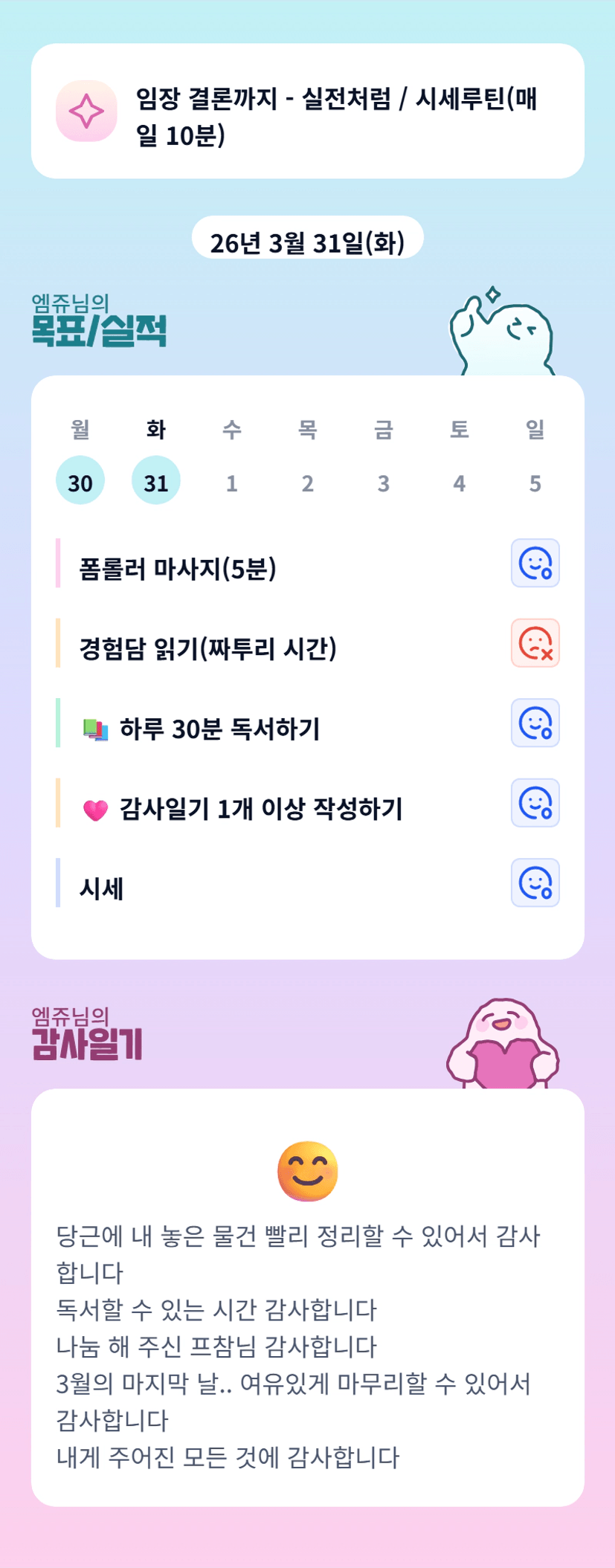 엠쥬님 3월의 마지막날까지 고생하셨어요~~~~ 4월 학교도 빠이팅🩷😊