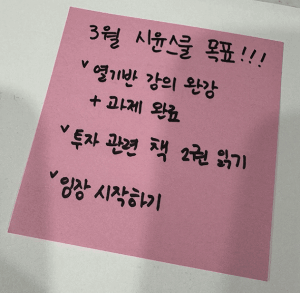 한 달 전 첫 조모임을 하며 조원들이랑 공유했던 3월 목표가 있었는데요.