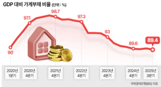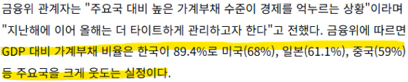 2021년대비 가계부채 비율이 낮아지고 있지만 주요국들대비 아직 높은 수준이다.