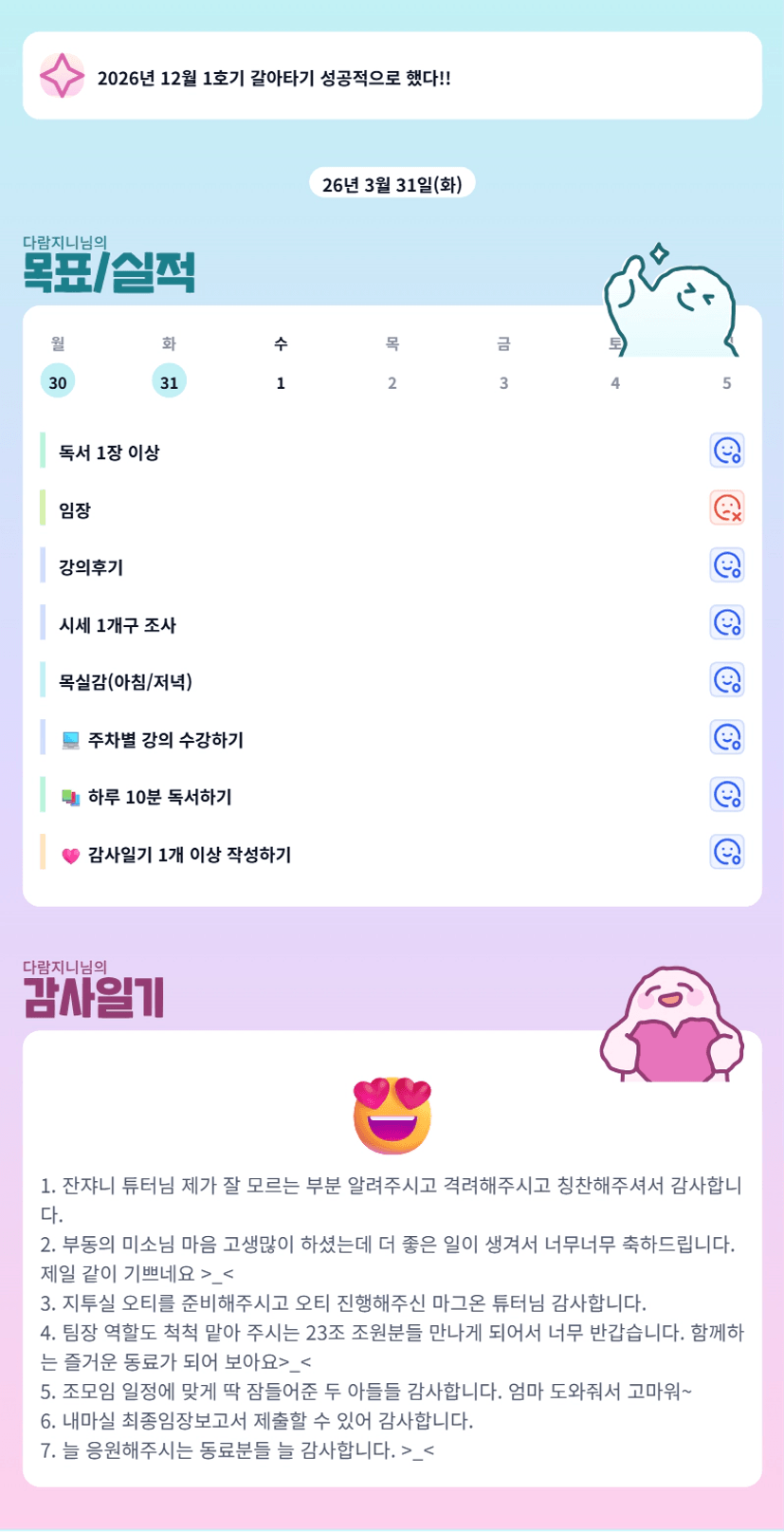 지니님 ~~ 이번달 정말 고생 많으셨습니다!! 엄마 도와주는 우리 아들들 🩷 4월 지투실도 화이팅입니다 !!! (콩이콩이님 특별히 잘 부탁 드립니다 ㅋㅋㅋㅋㅋㅋ)