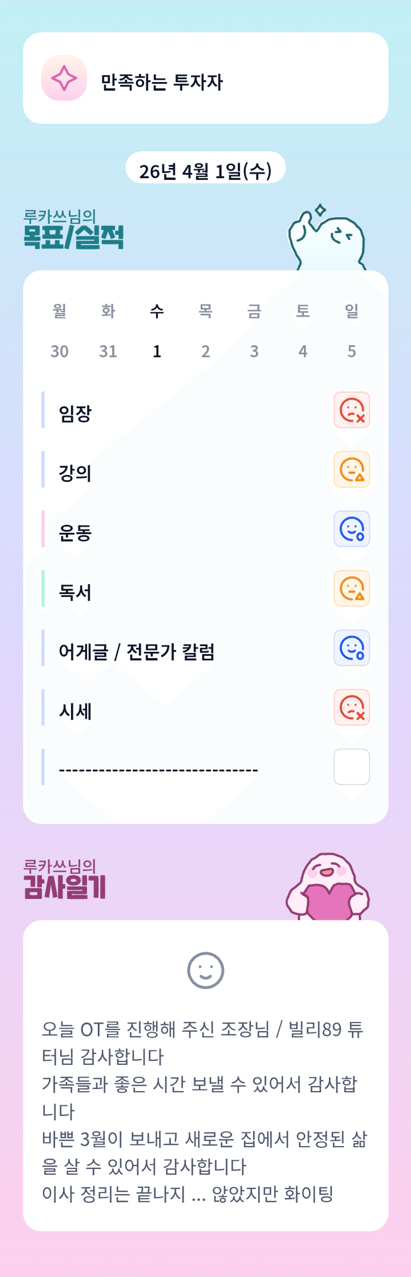 루카쓰님 이사하셨나보군요!?!?ㅎㅎ 축하드립니다! 이번 달 함께 소중한 시간 만들어가면 좋겠습니다~!파이팅!ㅎㅎ