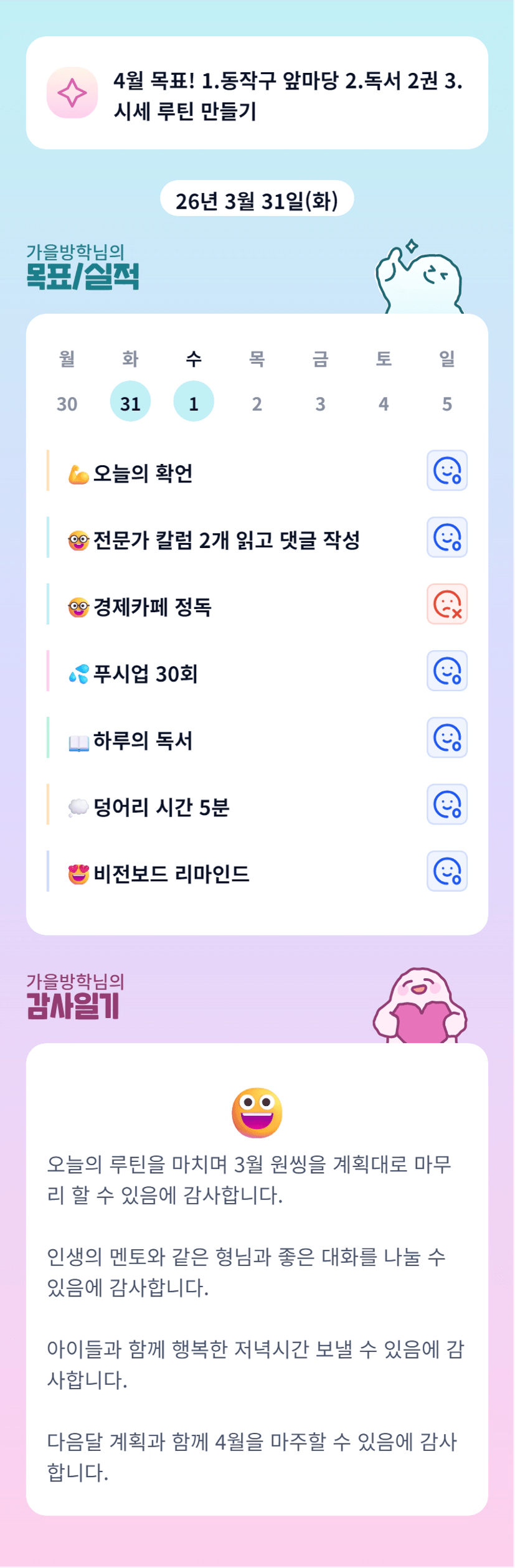 우와 루틴이 너무 구체적이라 좋네요!! 방학님 4월도 화이팅이에요!! 이제 못본다니!!!ㅠㅠ 또 만나요!!!
