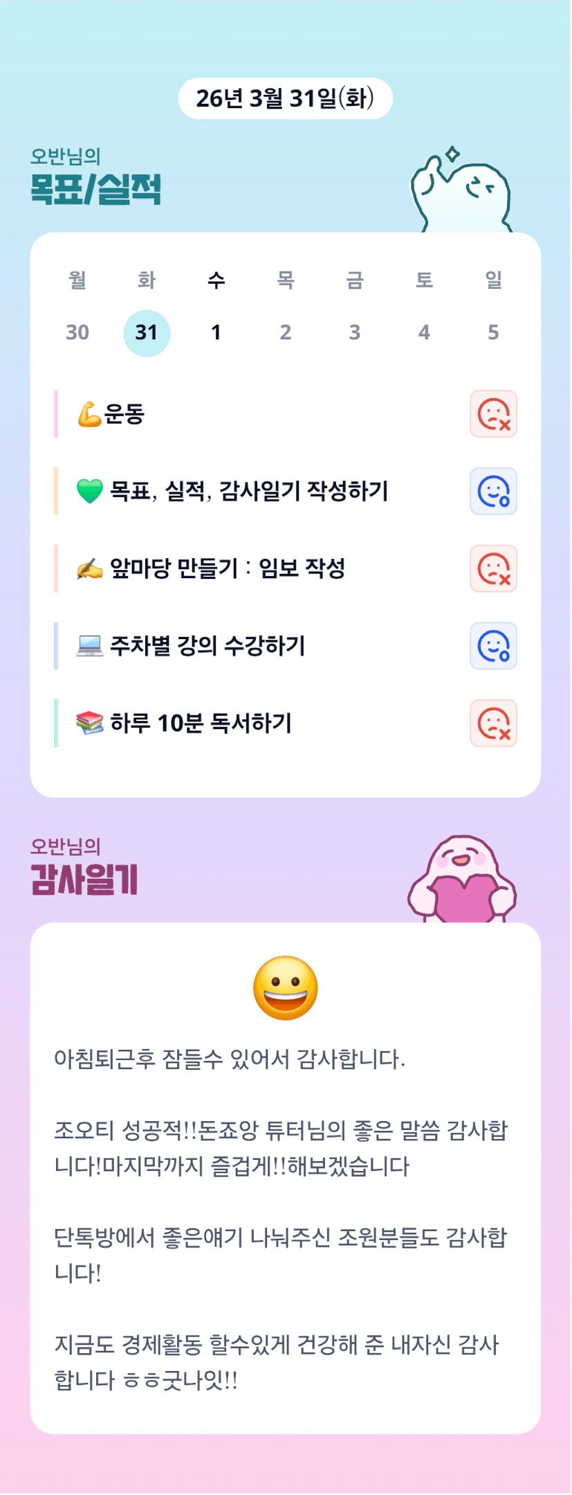 오우야 아침 퇴근이라니 정말 대단하십니다 오반님! 1달간 으쌰으쌰 잘 해봐요!!!!