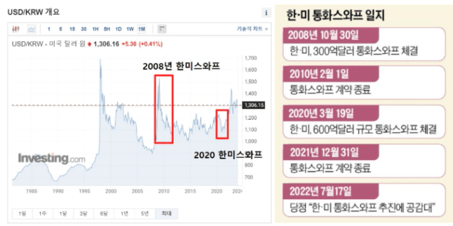 통화스와프 개념 : 외환차입이 아닌 달러와 원화를 교환하면서 필요할 때 달러를 공급받을 수 있다. 수수료도 없고 계약기간만큼만 쓰고 돌려주면 된다는 감정이 있음